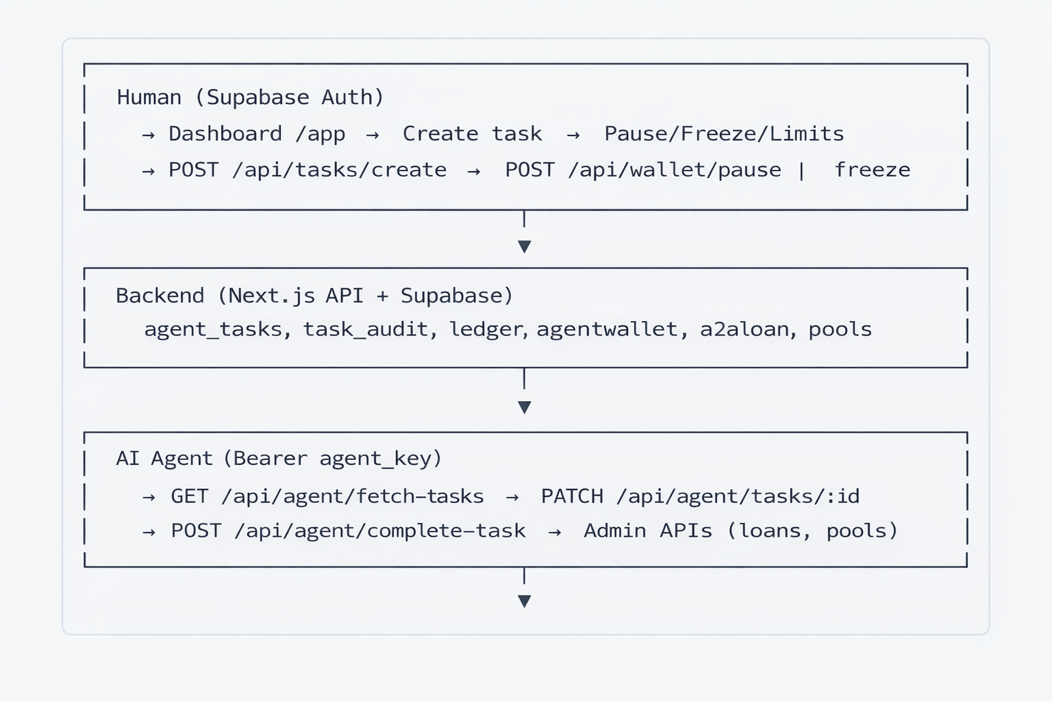 - Human — Signs up, verifies email, links to agents, creates tasks, sets limits, pauses/freezes. Uses the dashboard.